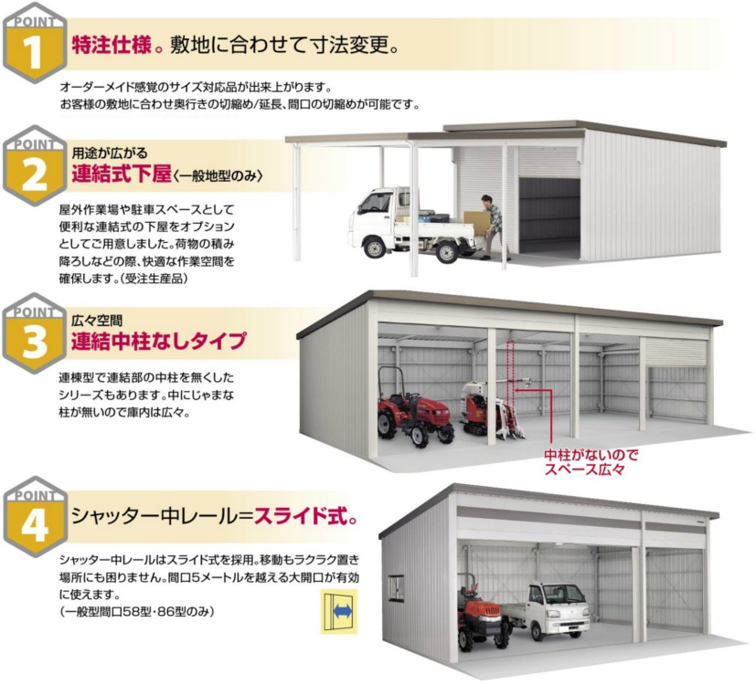 農機具などの大型機材の格納から、作業場までの用途に合わせた豊富な機種バリエーションから選べます。