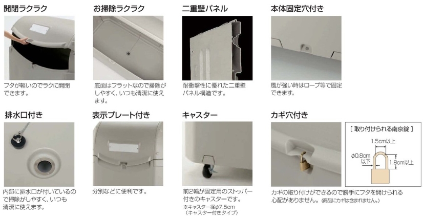 丈夫でサビないプラスチック製。軽量タイプのフタで開閉ラクラク!