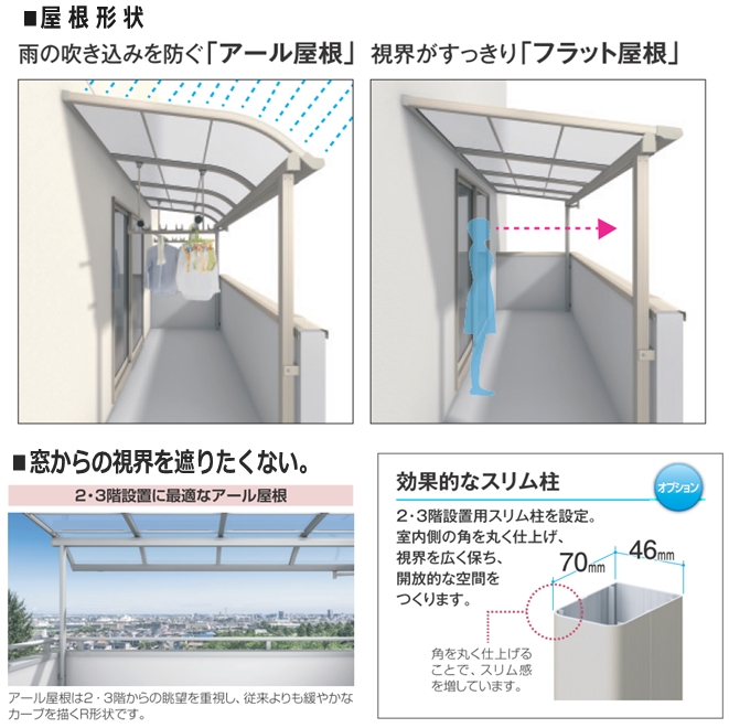 眺望を遮らない緩やかなカーブのアール屋根と視界すっきりのフラット屋根。