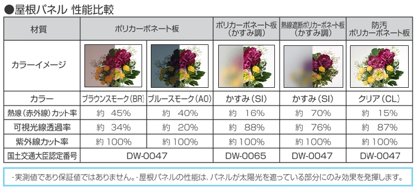 屋根パネル色:ブラウンスモーク(BR)/ブルースモーク(AO)/ポリカーボネート板(かすみ調)SI/
