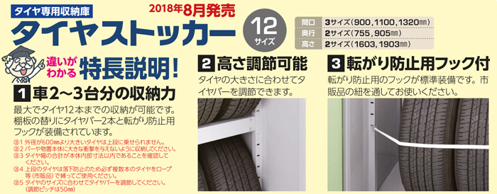 最大でタイヤ12本までの収納が可能です。
